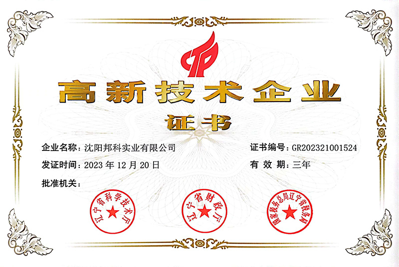 恭喜沈陽邦科實業有限公司經過嚴苛審核,從眾多企業中脫穎而出,榮獲由遼寧省科學技術廳、遼寧省財政廳、國家稅務總局遼寧省稅務局聯合頒發的“國家高新技術企業”證書。